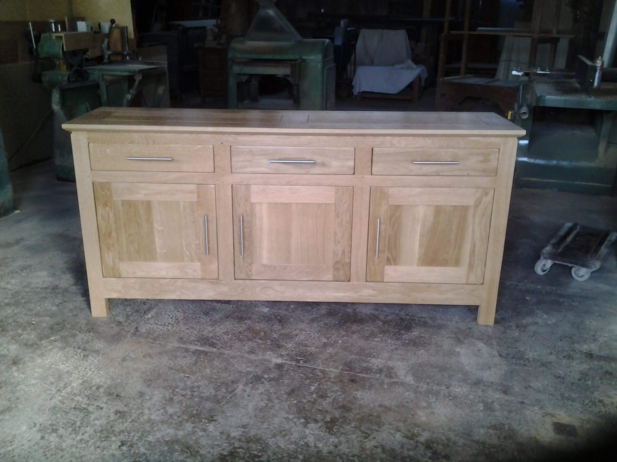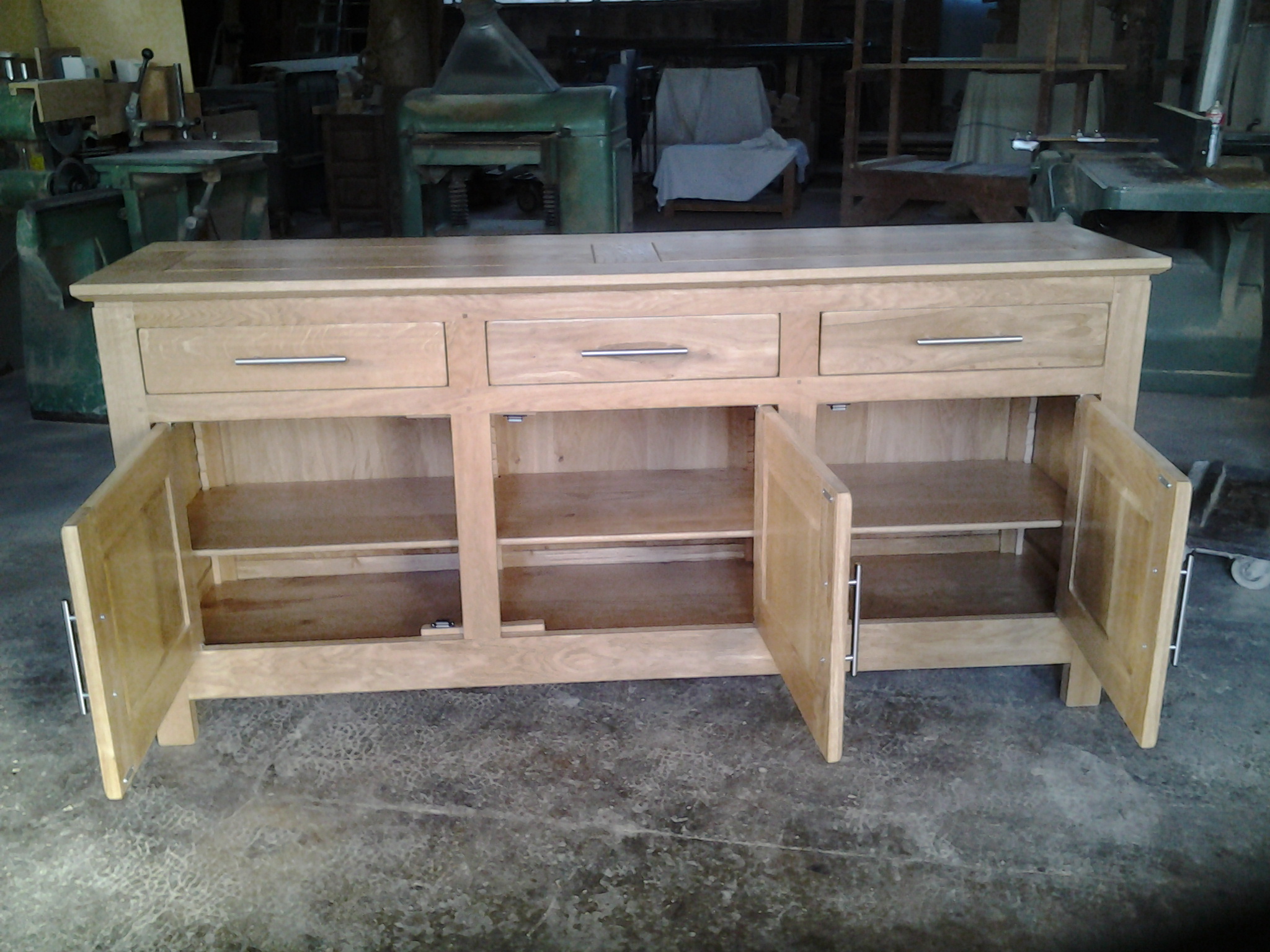 Bahut bas moderne 3 portes, 3 tiroirs, 100 % chêne massif, 3 rayons sur crémaillère.