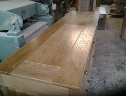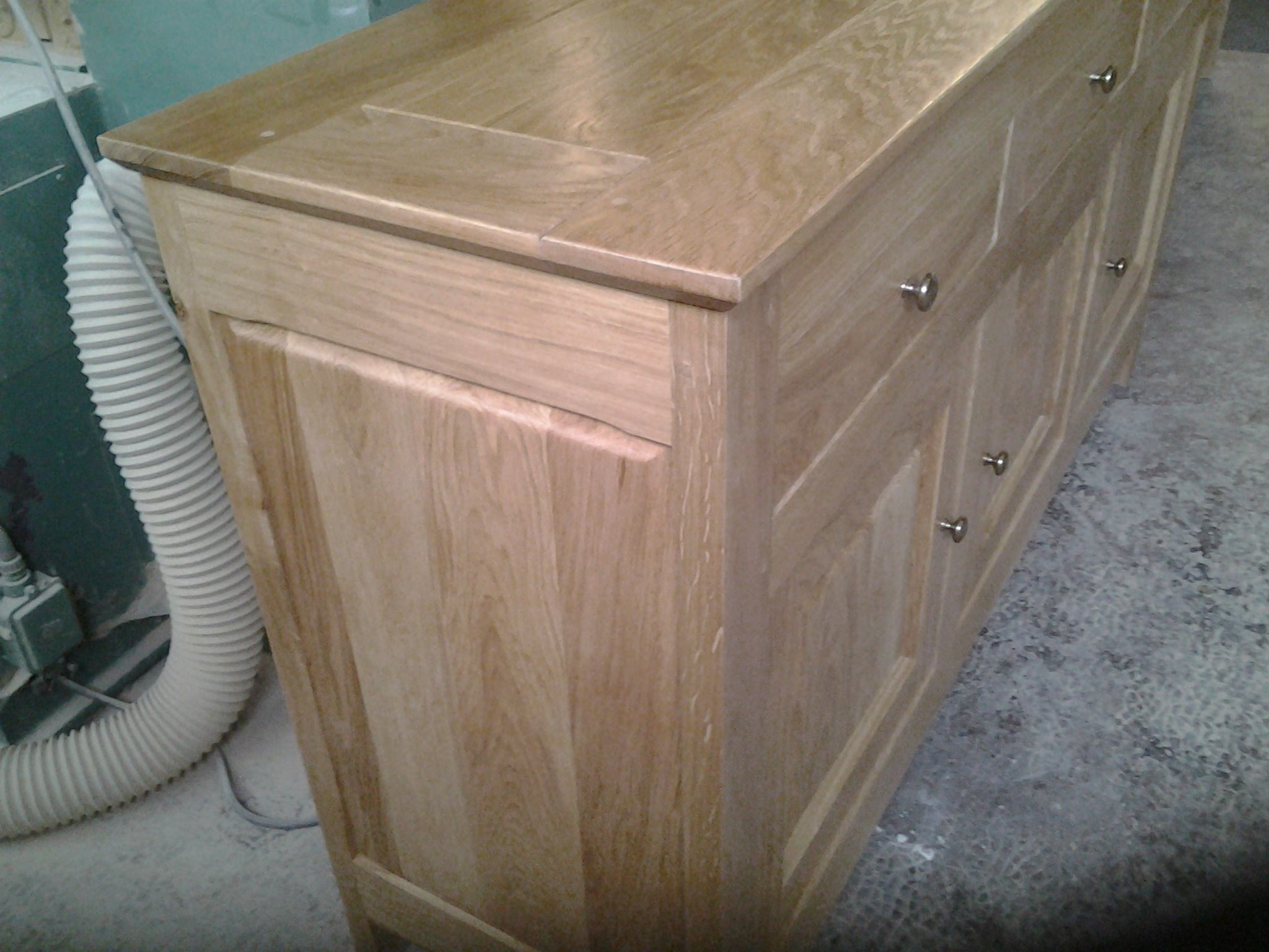 Bahut bas moderne 3 portes 3 tiroirs boutons vieux bronze, 2 rayons sur crémaillère, 100 % chêne massif.