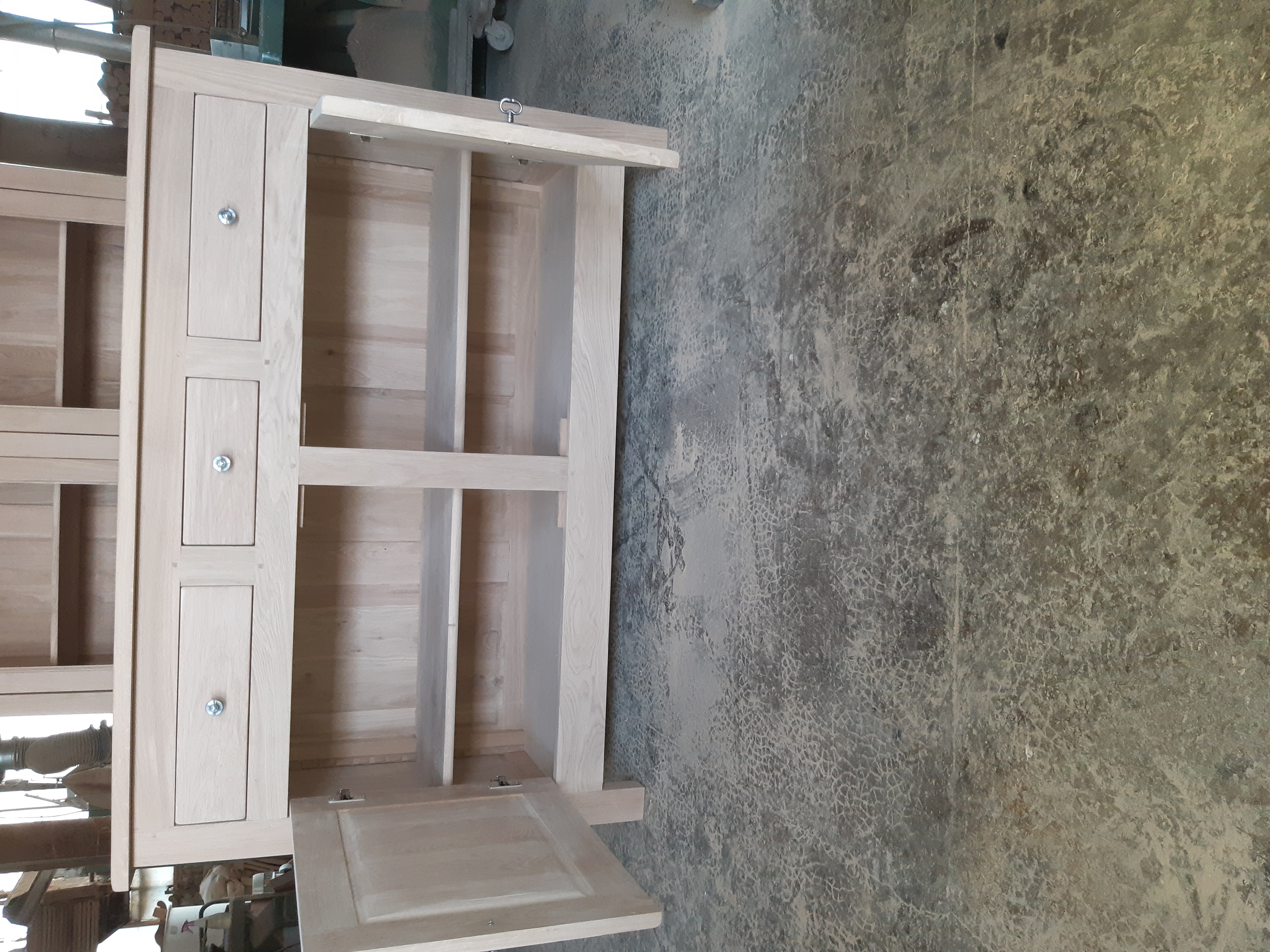 Bahut bas rustique 2 portes, 3 tiroirs, 2 rayons sur crémaillère, porte moulures profil, 100% chêne massif. Dimensions. Long 1.50 prof 0.50 haut 1.00.