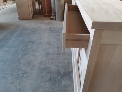 Bahut bas moderne sur plinthe 4 portes coulissantes, 2 tiroirs avec ouverture par chanfrein, 4 rayons sur crémaillère, 100%chêne massif, dimensions long 2.50 haut 1.05 prof 0