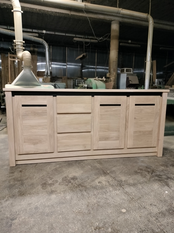 Bahut bas moderne 3 portes 3 tiroirs, 4 rayons sur crémaillère. Portes avec bande laqué noir.100% chêne massif. Ouverture par chanfreins. Long 2.20 Prof 0.55 haut 1.00.