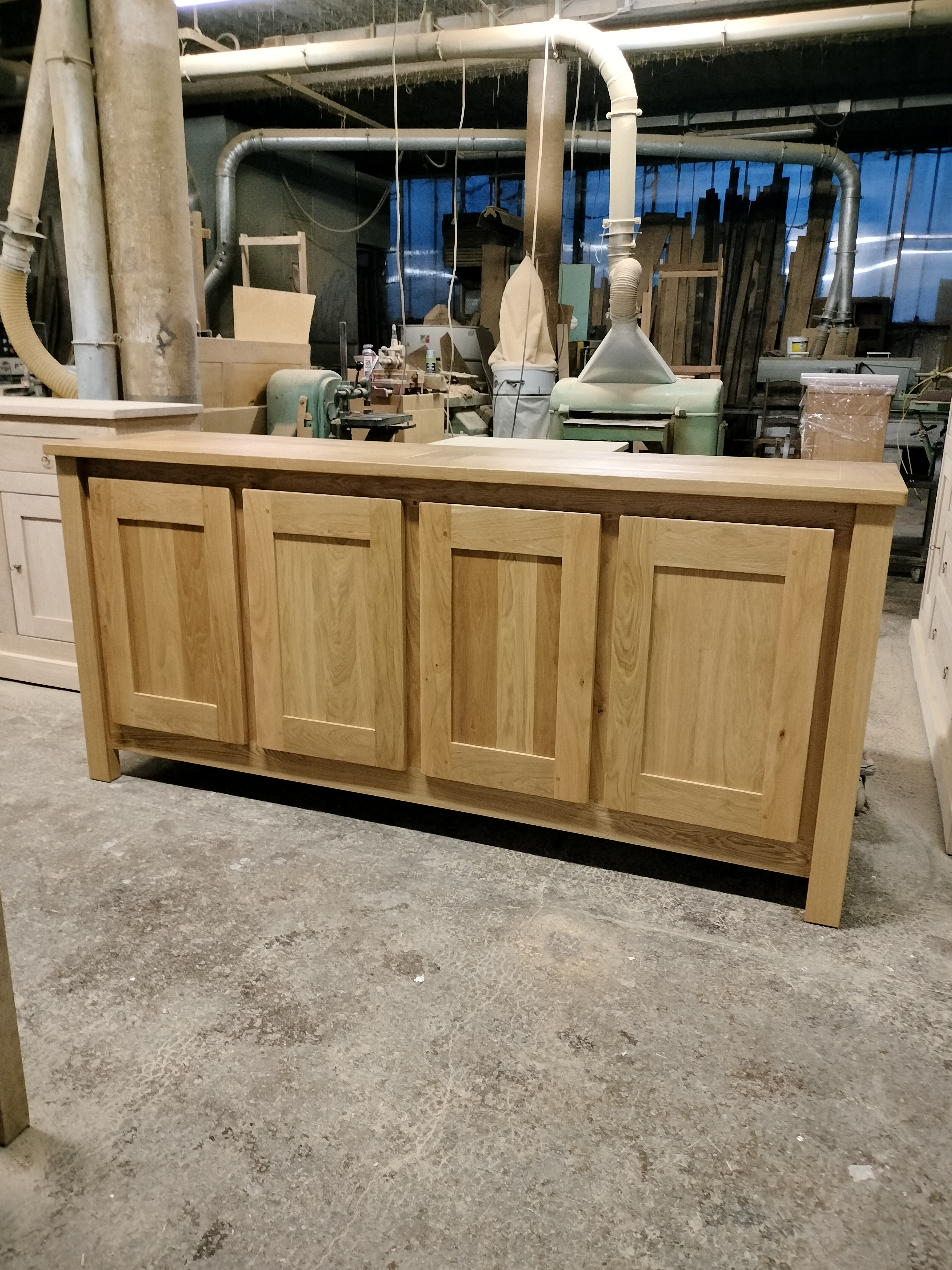 Bahut bas moderne 4 portes ouverture par chanfreins. 6 rayons sur crémaillère. Sans moulures tenons et mortaises. 100% chêne massif.