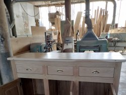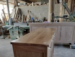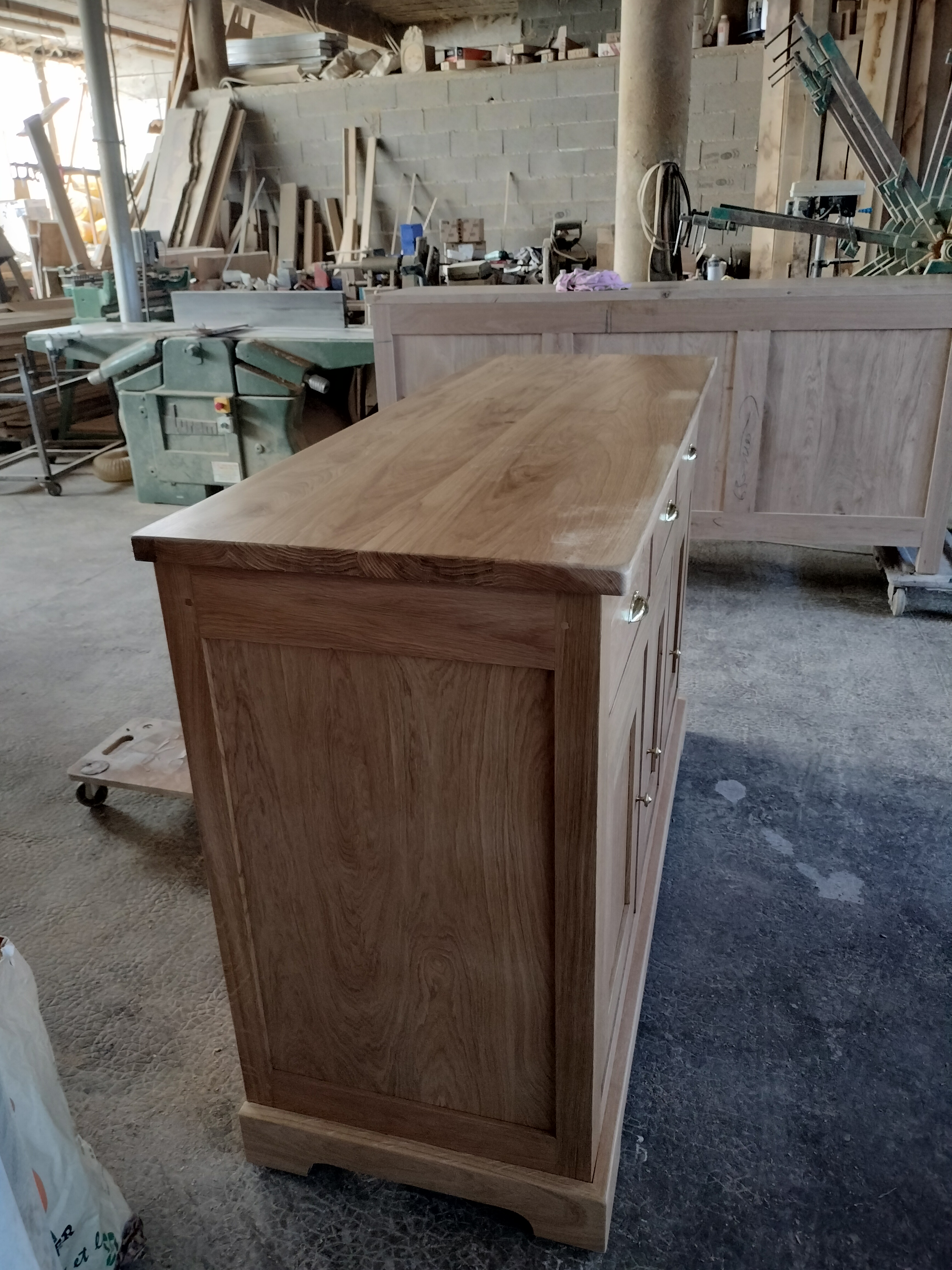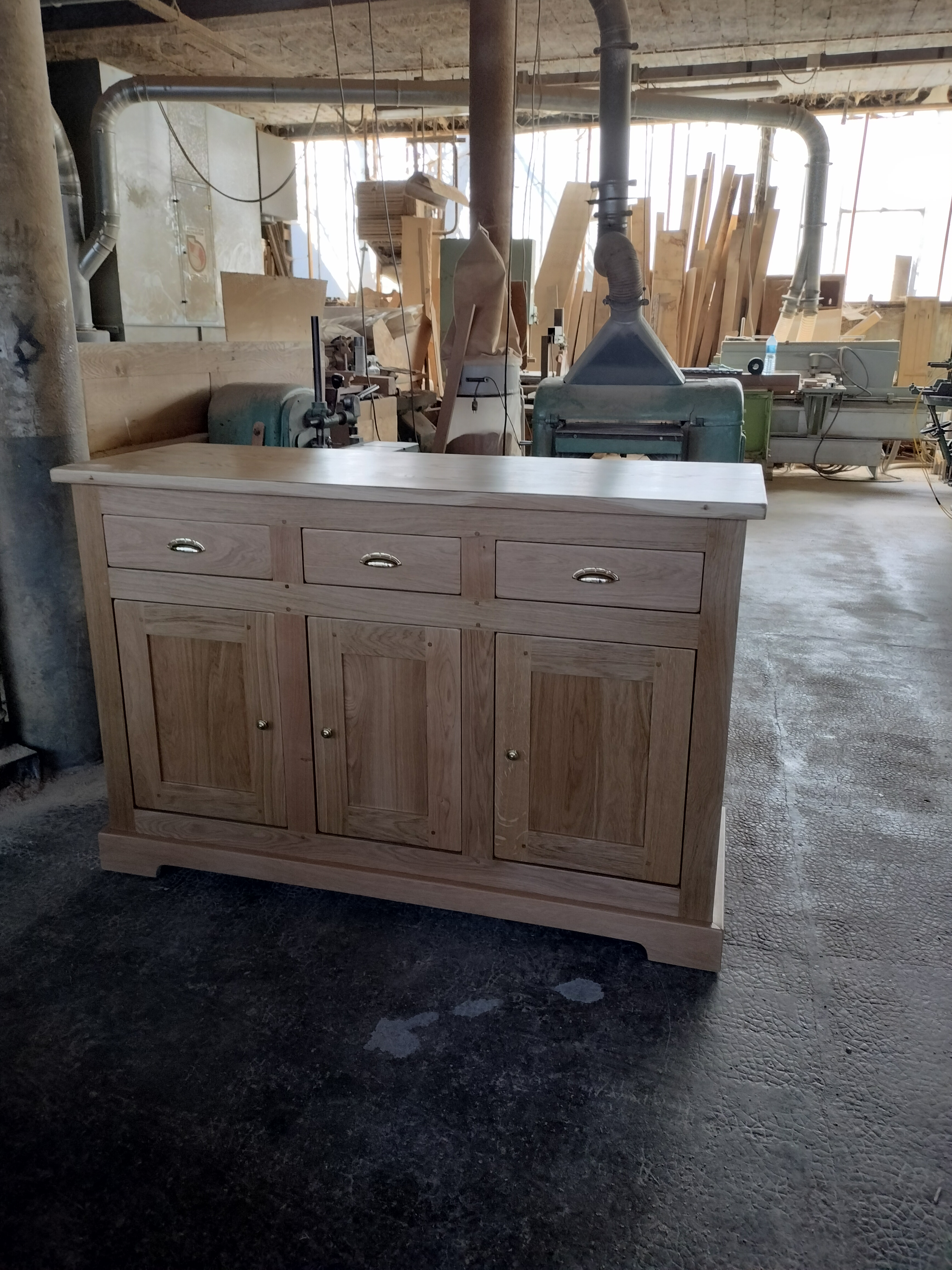 Bahut bas rustique 3 portes 3 tiroirs, avec plinthe.2 rayons sur crémaillère, 100% chêne massif. Long 1.50 haut 1.00 prof 0.55.