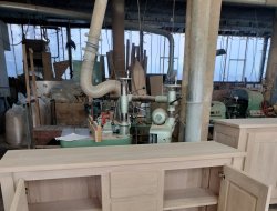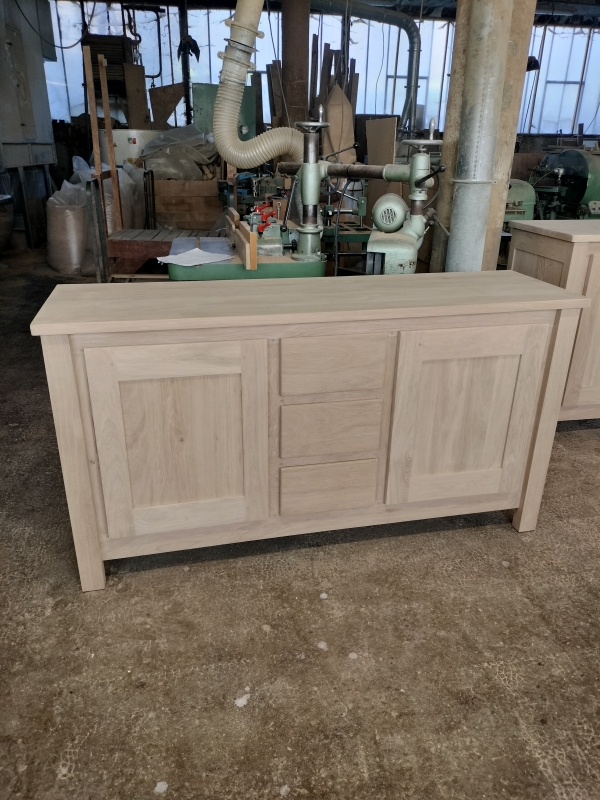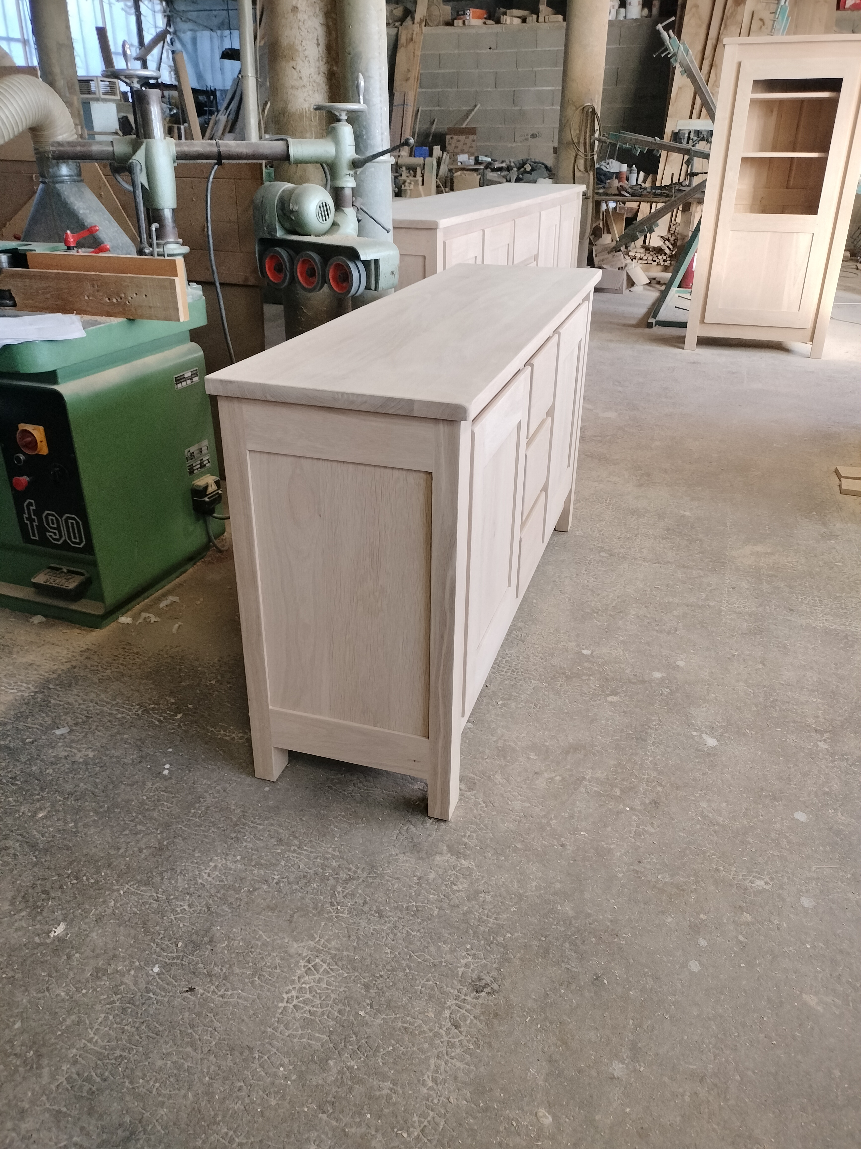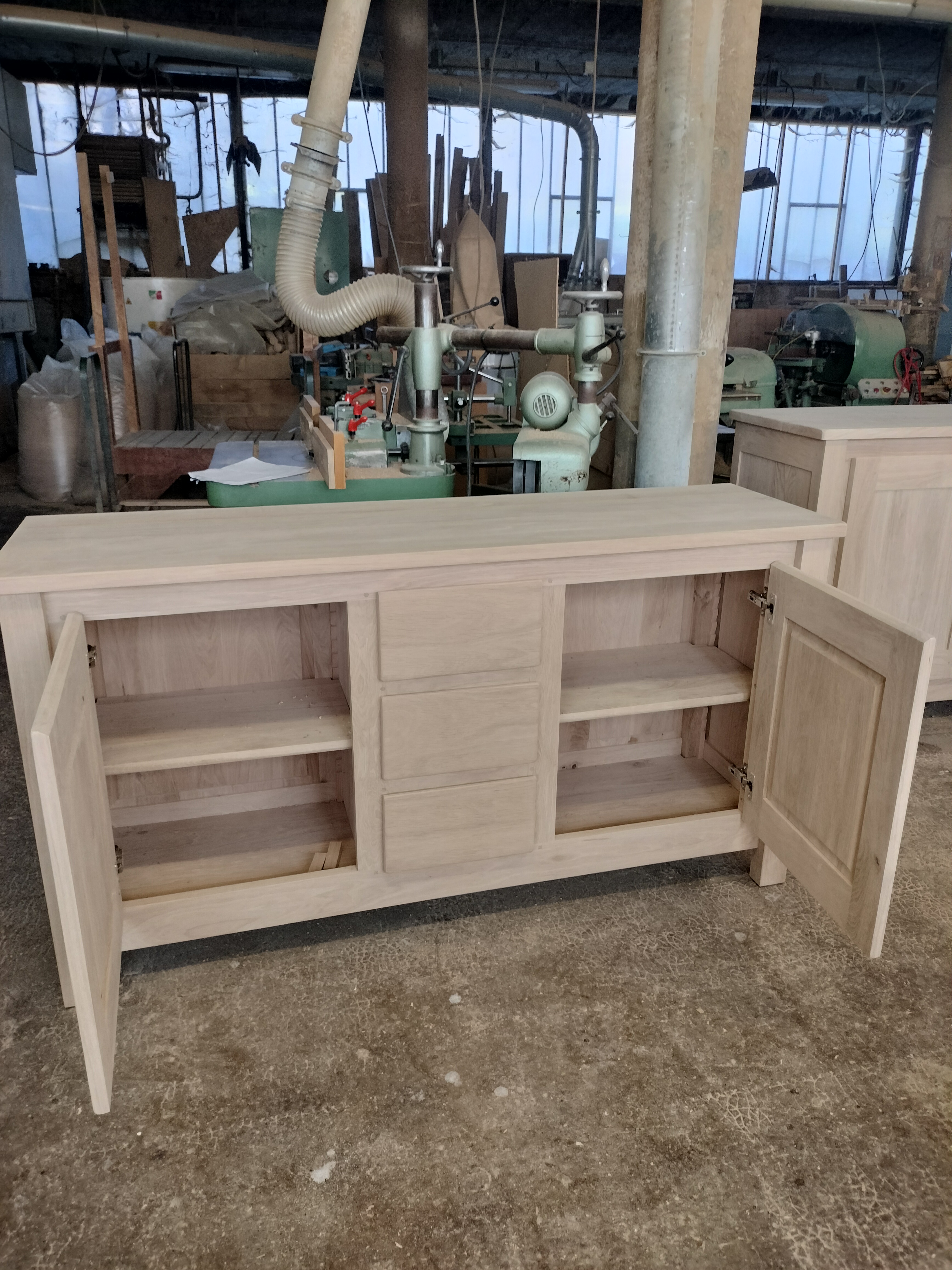 Bahut bas moderne 2 portes 3 tiroirs ouvertures par chanfreins. 2 rayons sur crémaillère. Long 1.70 haut 0.90 prof 0.47. 100% chêne massif.