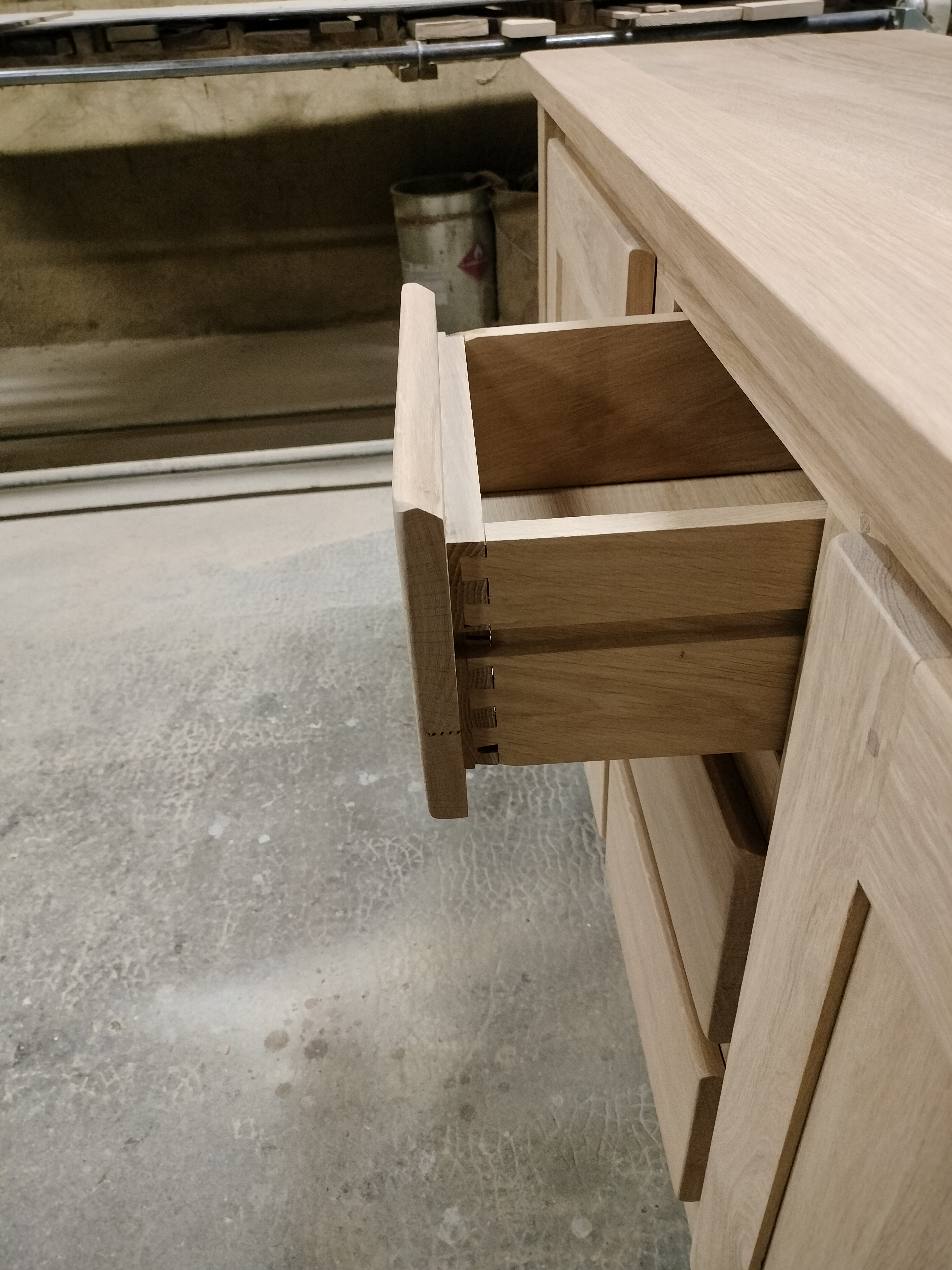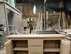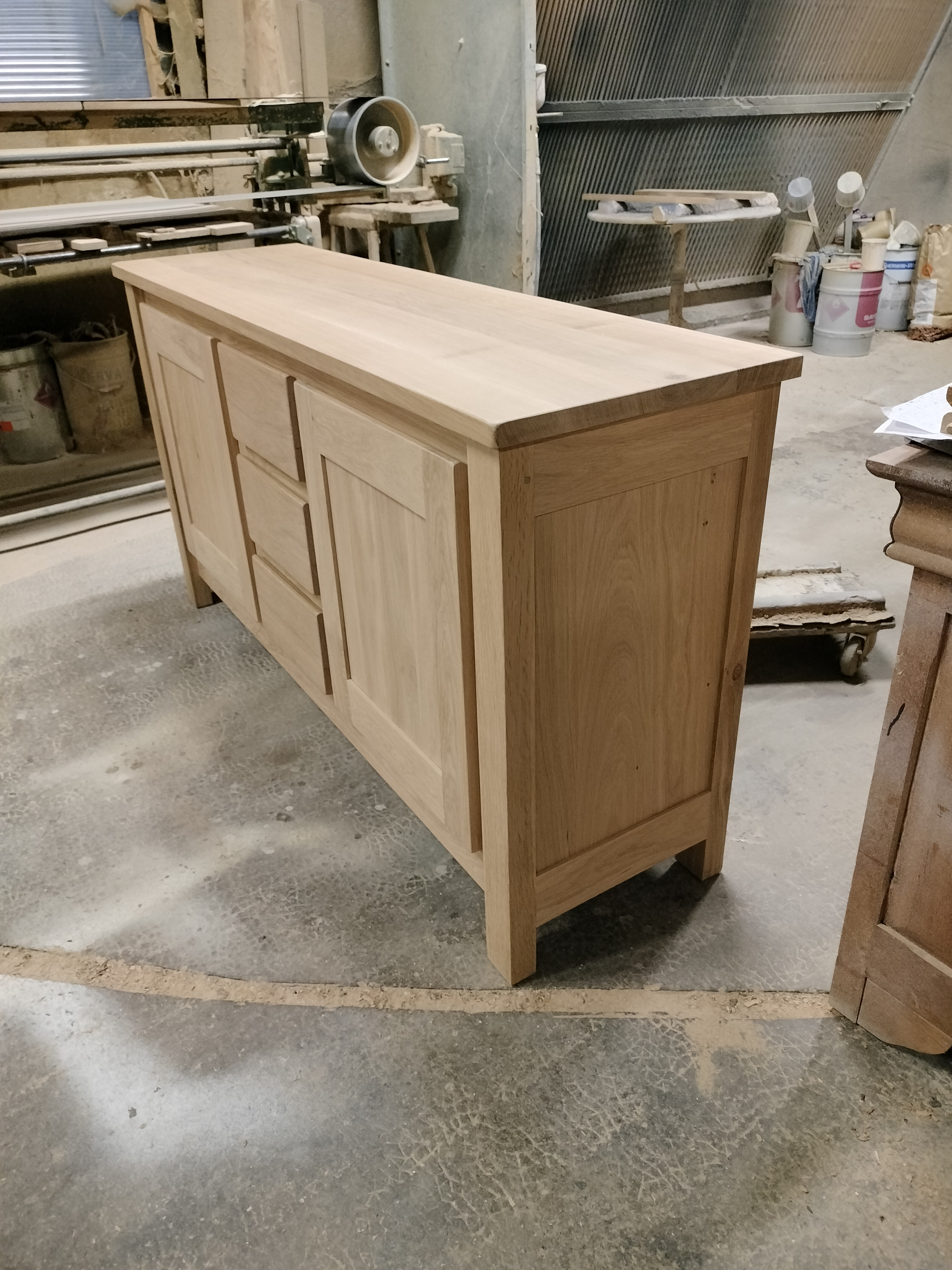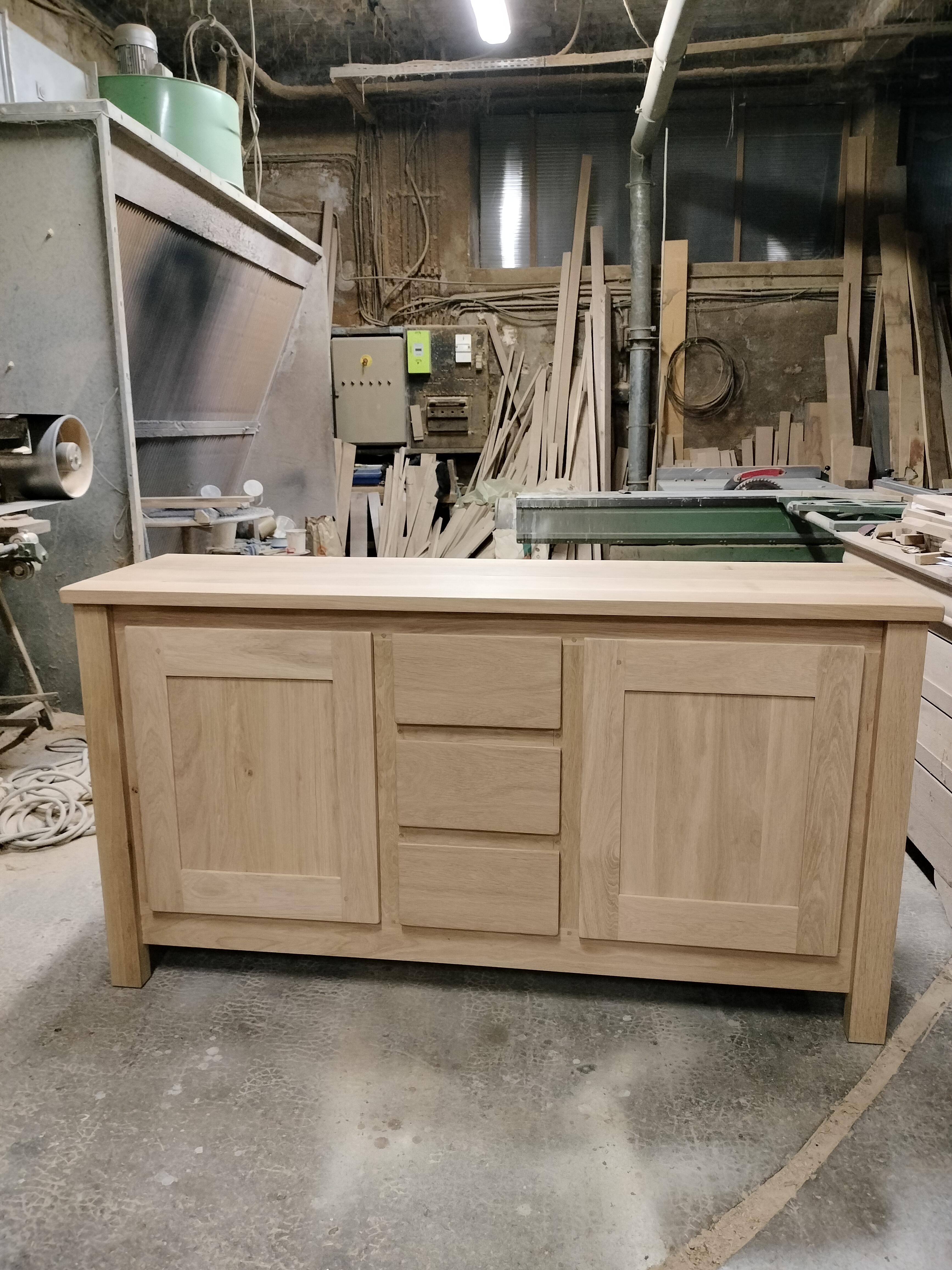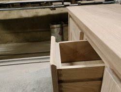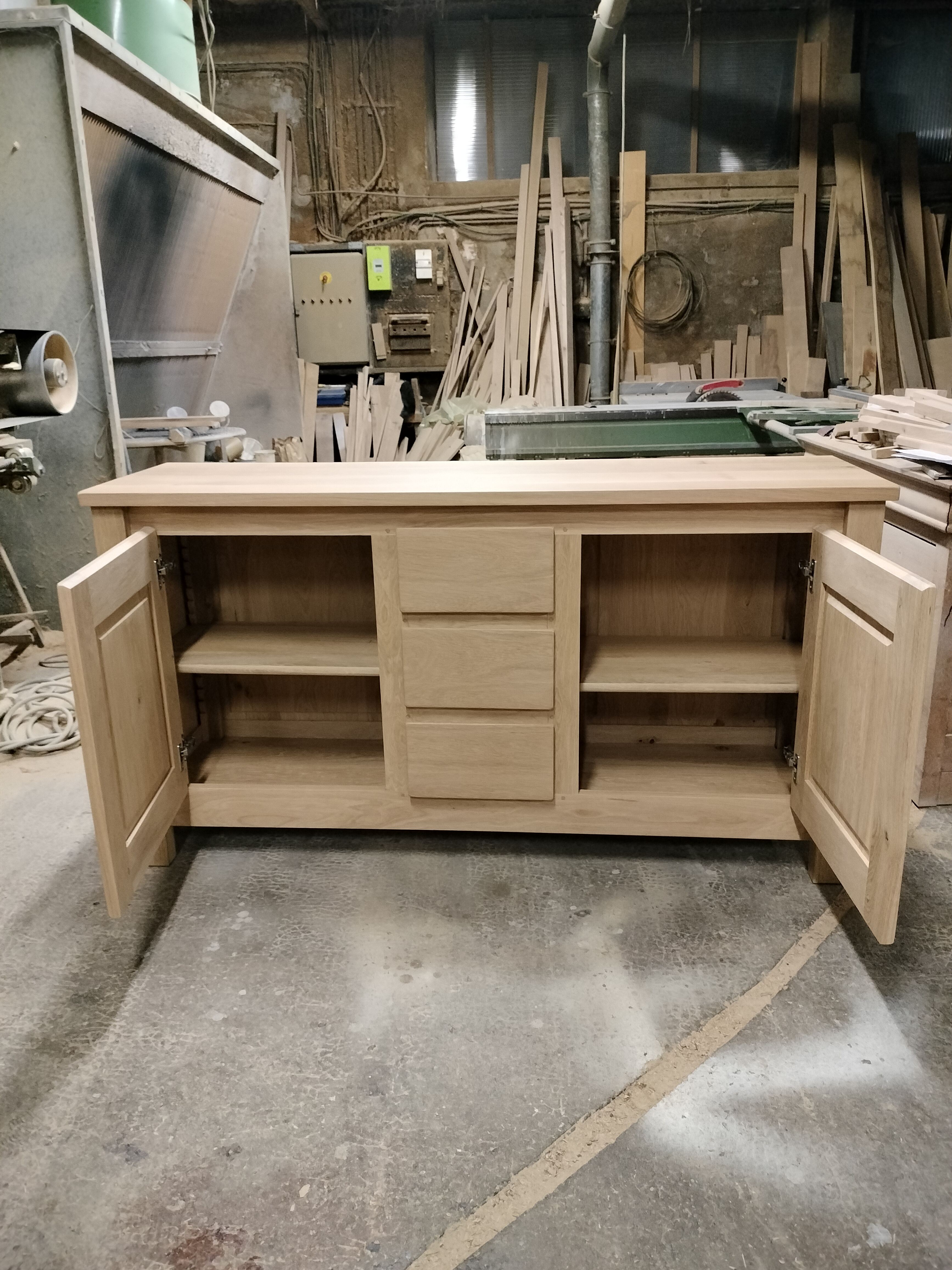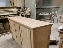 Bahut bas moderne 2 portes 3 tiroirs ouvertures par chanfreins. 2 rayons sur crémaillère, long 1.70 prof 0.48 haut 0.90. finition vernis pu effet naturel.